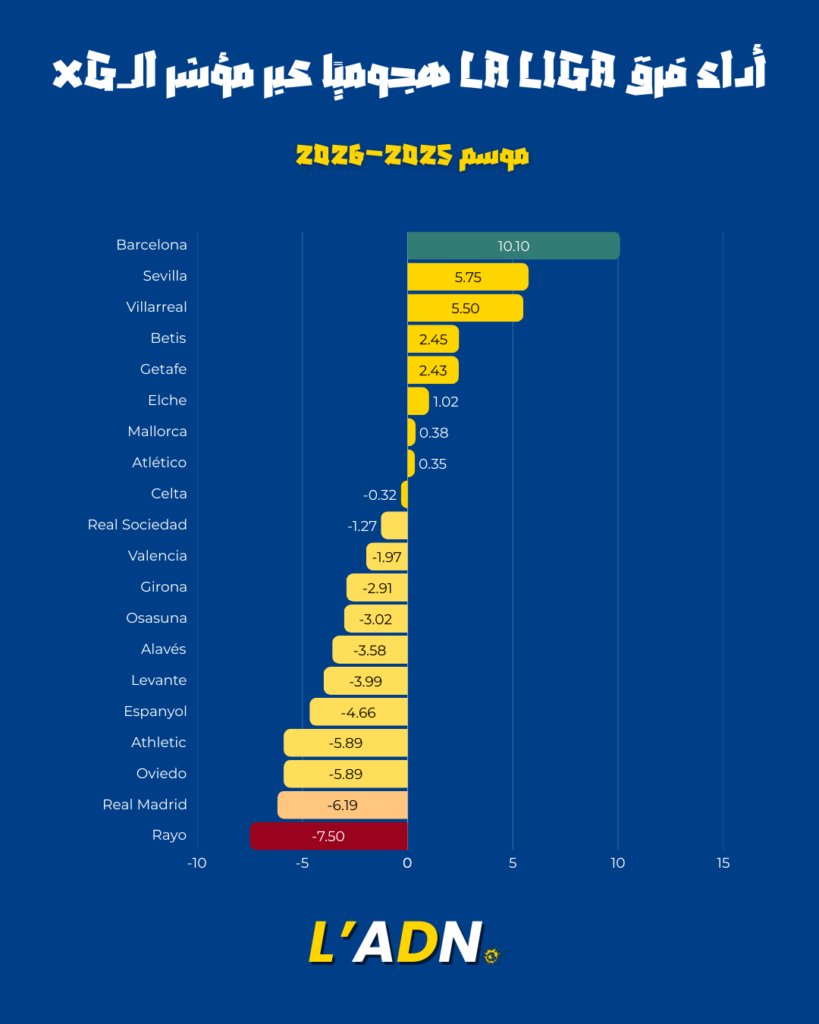 En Liga, le contraste entre le FC Barcelone et le Real Madrid est frappant à travers l’xG. Le Barça marque nettement plus de buts que ce que la qualité de ses occasions laisserait prévoir, preuve d’une grande efficacité dans les derniers mètres. À l’inverse, le Real Madrid ne parvient pas à convertir au niveau attendu : son xG est très supérieur au nombre réel de buts marqués. Cette situation pose la question de la finition, mais aussi de la confiance offensive et du profil des attaquants en place. Lorsqu’une équipe crée beaucoup d’occasions mais ne marque pas à la hauteur de ce volume, le risque est de perdre des points dans des matches pourtant dominés, ce qui peut coûter cher dans la course au titre.