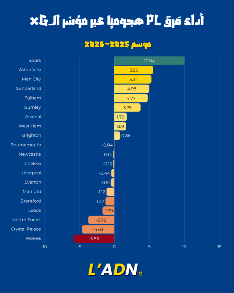 Tottenham apparaît comme l’un des meilleurs exemples de surperformance offensive : environ 15 buts attendus pour 25 buts marqués, ce qui illustre une grande efficacité dans la surface. Cela signifie que les joueurs offensifs convertissent des situations parfois compliquées en buts, et que les occasions créées sont souvent bien placées. Manchester City, de son côté, combine volume et qualité : un xG élevé et un nombre de buts marqués à la hauteur de sa domination. D’autres équipes comme Aston Villa, Fulham ou encore Sunderland se distinguent aussi positivement. Cette hiérarchie offensive suggère que, même si le classement brut reste important, certaines équipes sont mieux armées que d’autres pour tenir le rythme sur la durée.
